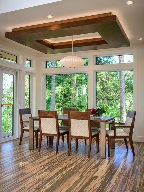 Formal or informal, relaxed or refined. Bulkheads can help create a mood that a flat ceiling just can't do on its own. In this example, it is constructed of the same wood as the chairs and table top that truly sets the dining area on its own.