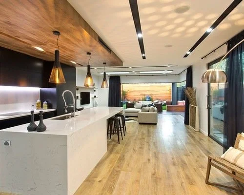 When it comes to open-plan kitchen and living areas, a bulkhead can be used to great effect, serving to define space and function. This bulkhead extends from two walls to span the kitchen, ending in line with the kitchen island. Being white, it contrasts with the timber-lined ceiling in the rest of the large open space. It also offers the opportunity for recessed lighting, pendant lighting and greater air projection.