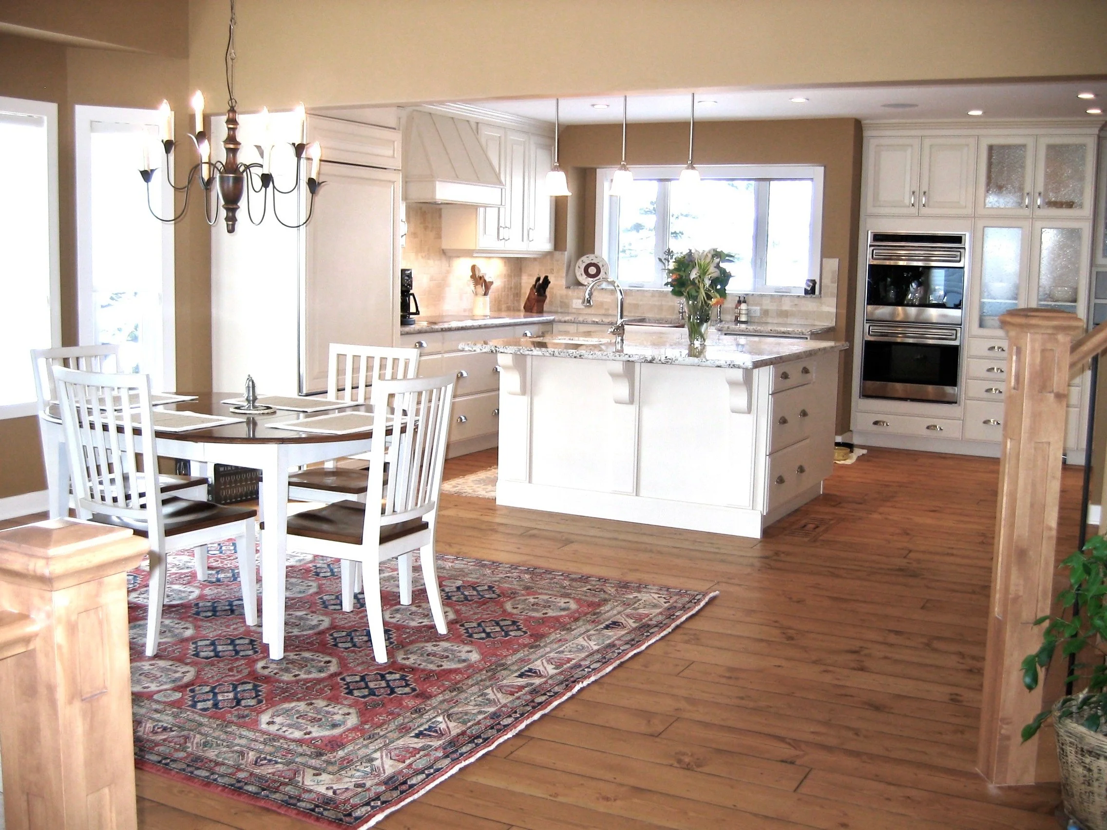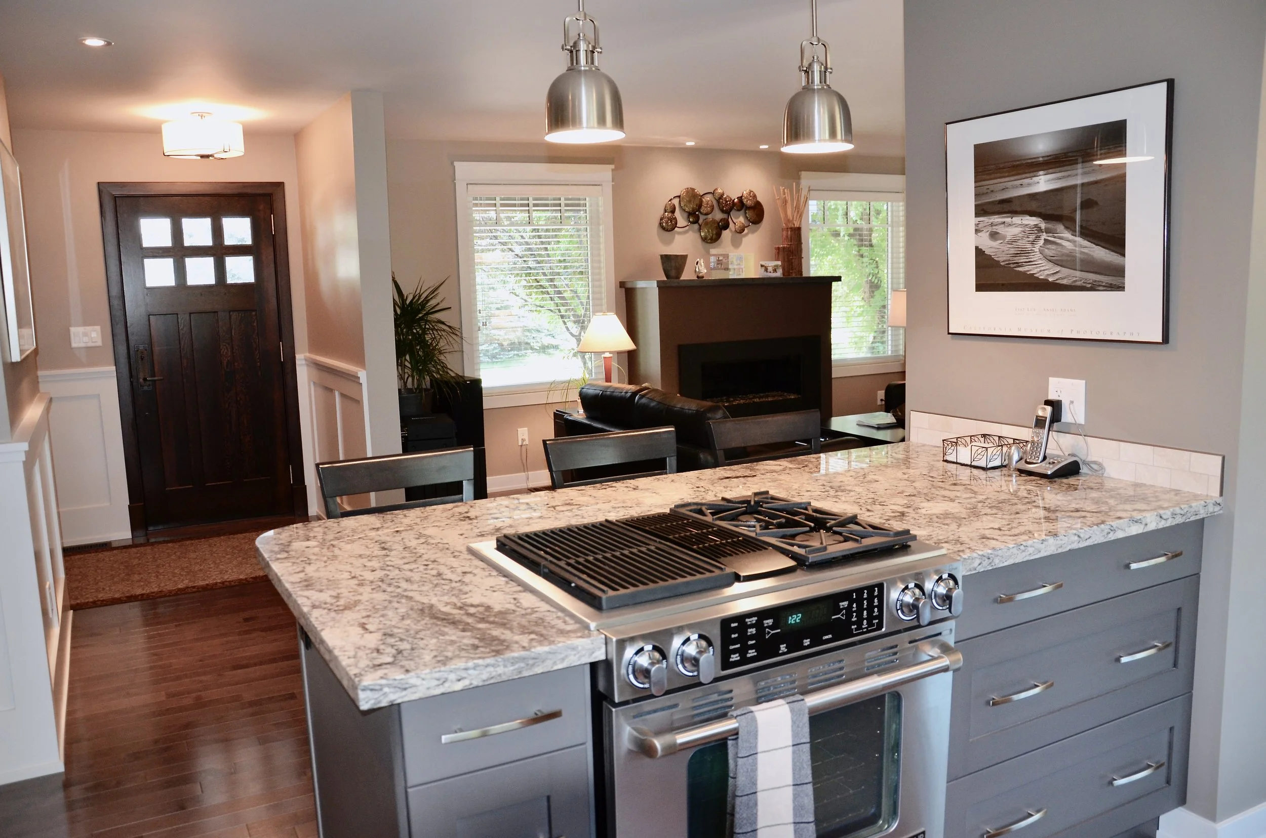 The party always ends up in the kitchen. So why not embrace it? For this couple of foodies, entertaining at home was a top priority for their kitchen renovation. We started by opening up the wall between the kitchen and dining room to create a bright, open space. From there, we designed a 10 foot x 3-1/2 foot island with integral sink, that functions as both food prep area, and gathering space. So while the chef is preparing meals, he or she (or in their case, usually both) can carry on the conversation with guests while they enjoy a cocktail. They opted for bright white cabinets with offsetting grey island for a contemporary, yet timeless look. The dining room facing the rear yard was designed to let the outdoors in by installing a huge, 3 panel patio door that also offered easy and convenient access to the BBQ for those warm summer days when the party migrates outdoors.